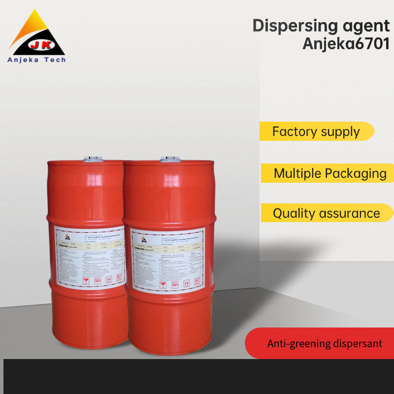 Anjeka-6701 is a copolymer solution containing acidic groups, designed for use in solvent-based coatings and ink systems. It effectively prevents the settling of inorganic fillers and the greening of PE system coatings.