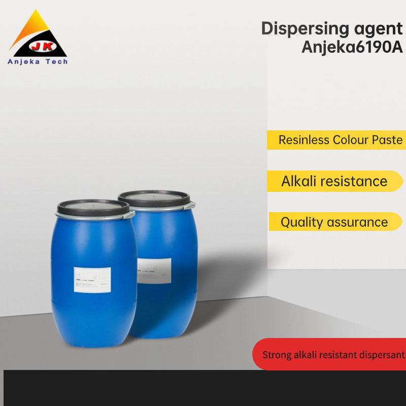 Anjeka6190A is a high-molecular-weight polymer dispersant, designed as a standard additive for resin-free pigment concentrates. It is suitable for waterborne coating systems, printing inks, and adhesives. Specifically formulated for the milling of inorganic pigments such as titanium dioxide, matting agents, calcium carbonate, etc., it exhibits excellent viscosity reduction properties and outstanding alkali resistance.