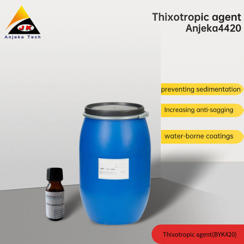 Anjeka 4420 is a liquid rheological additive suitable for water-borne coatings and adhesives. The additive produces highly thixotropic fluidity to improve sag resistance and settling resistance. The additive can be added later.